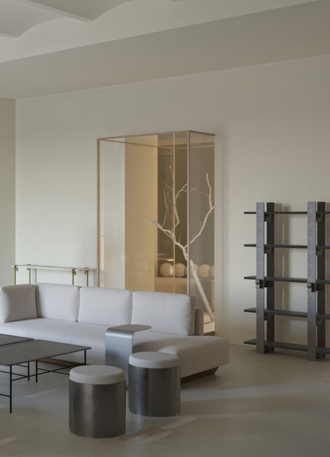 Центральным элементом стал стеклянный параллелепипед, который находится в центре и соединяет две комнаты. С одной стороны, это портал между двумя зонами, с другой — самостоятельный объект, задающий настроение. Он может становиться световым окном, лайтбоксом, витриной, отражая новое состояние пространства. Он универсален, подвижен, ненавязчив и не отвлекает от главного — от действий людей, которые находятся здесь.