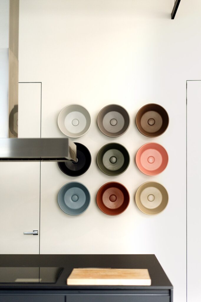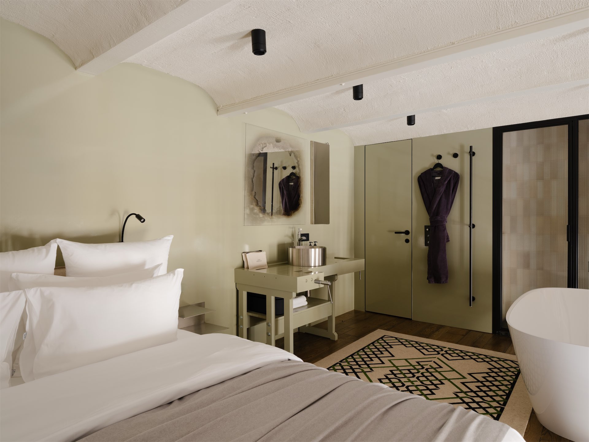 Фоном для исторических цитат здесь становятся натуральные материалы — металл, камень, дерево — и разнообразные фактуры: блеск керамической плитки во всю вертикаль гостиной, горизонтальное сияние патинированного зеркала. Экспозиция заменяет культурную программу в городе. По мнению куратора Анны Заведий (Not decor. Character), искусство с эмоциональным нарративом придает интерьеру глубину и индивидуальность. Важно: все работы доступны для онлайн-покупки или могут быть приобретены прямо из резиденции.