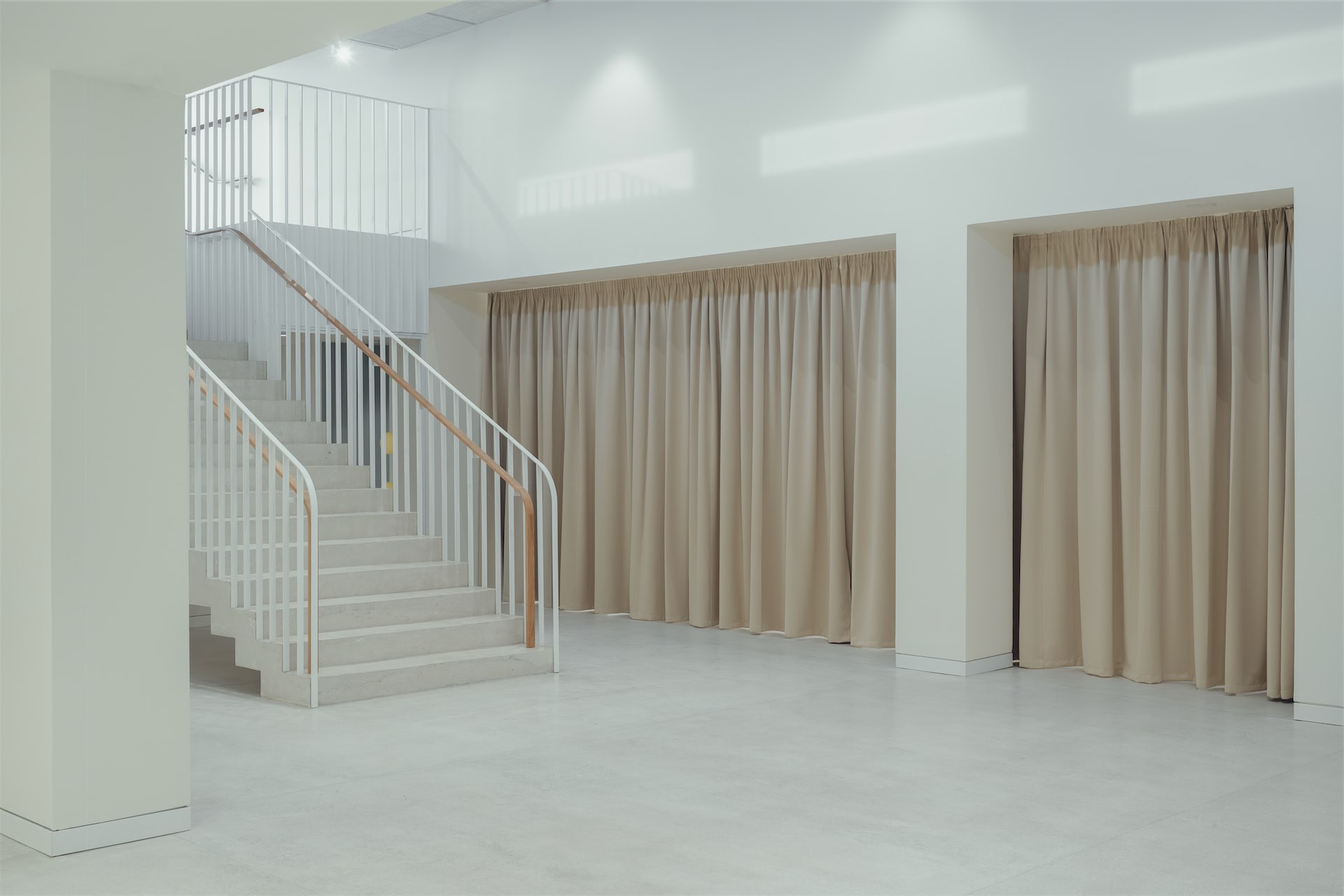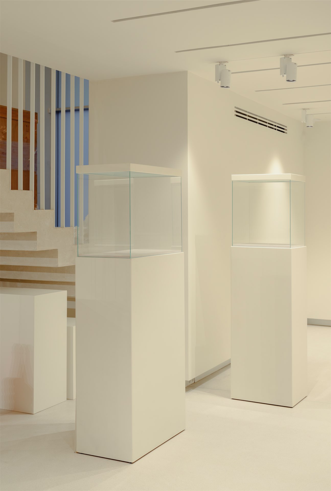Главная лестница, заданная конструкцией здания, переосмыслена и трактована как главная «артерия», организующая зонирование: пространства перетекают друг в друга, служебные, выставочные и публичные зоны оказываются связаны между собой. Горизонтальность процессов — важная часть философии «Виктории». И в интерьере это читается буквально: маршруты не диктуют, а предлагают мягкие переходы между визуально сцепленными пространствами. Дизайн ограждения лестниц позволяет использовать лестничное пространство как продолжение экспозиции и способ навигации.
