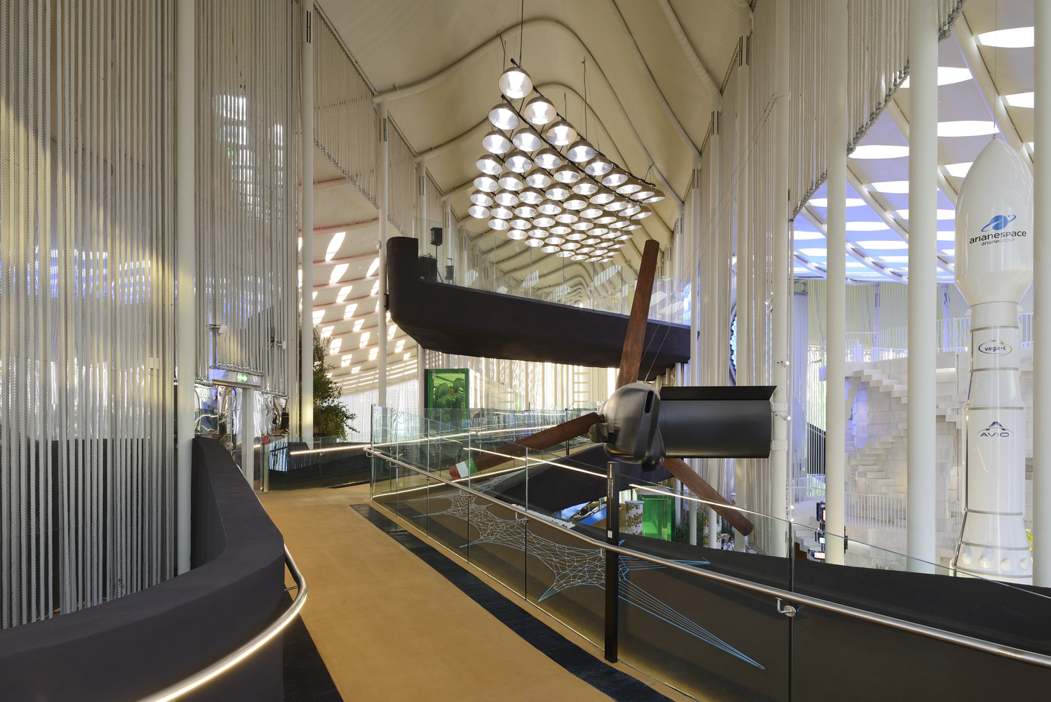 Павильон был задуман как эксперимент в области многоразового использования материалов и естественного охлаждения. Конструкция состояла из 150 тонких стальных колонн, поддерживающих три перевернутые лодки, окрашенные в цвета итальянского флага. Между корпусами была расположена кровельная мембрана, дополненная перфорированными металлическими листами для фильтрации солнечного света. Она была связана с системой канатов, изготовленных из переработанных пластиковых бутылок, которые формировали фасадное ограждение и обеспечивали затенение без использования кондиционирования воздуха.
