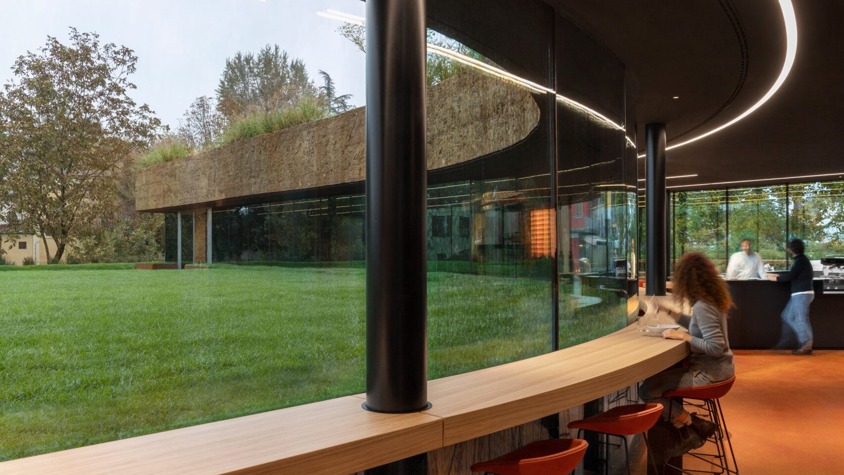 Проект Quisimangia — столовая для компании Mutti в Парме, спроектированная как здание с зеленой крышей, частично встроенное в ландшафт. Такой прием минимизирует визуальное воздействие на окружающую среду и улучшает тепловые характеристики пространства. В интерьере использован инновационный пол из переработанных томатных кожур — отходов производства Mutti.