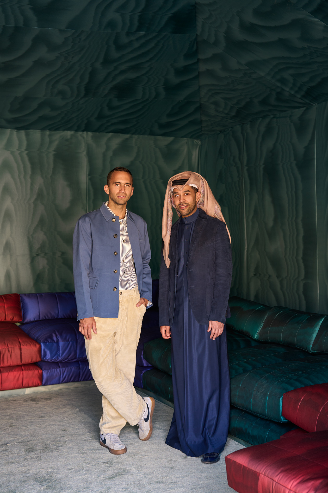 Концепция опирается на многовековые арабские ритуалы, укорененные в ландшафте. Получилось своего рода пространство пересечения культур и художественных языков, где формируется общая визуальная и смысловая иконография. Это многослойное путешествие — через пейзаж, язык и само пространство между ними.