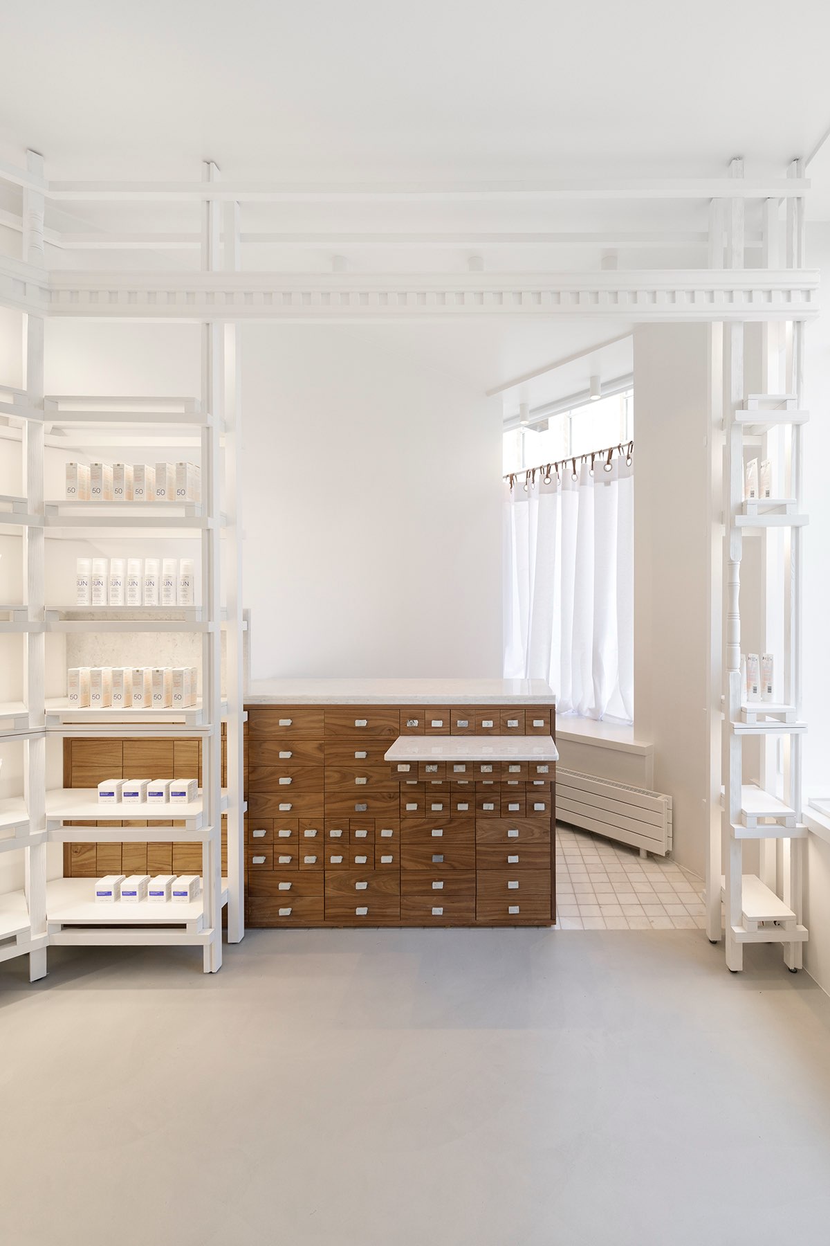 Пространство компактно и организовано как последовательность функциональных зон. Система стеллажей с тонкими профилями акцентирует внимание на продукте, центральный стол отсылает к лабораторной эстетике, а встроенный модуль для макияжа интегрирует косметическую линию в общий сценарий движения. Большие витрины обеспечивают естественное освещение, усиливая ощущение прозрачности и чистоты.