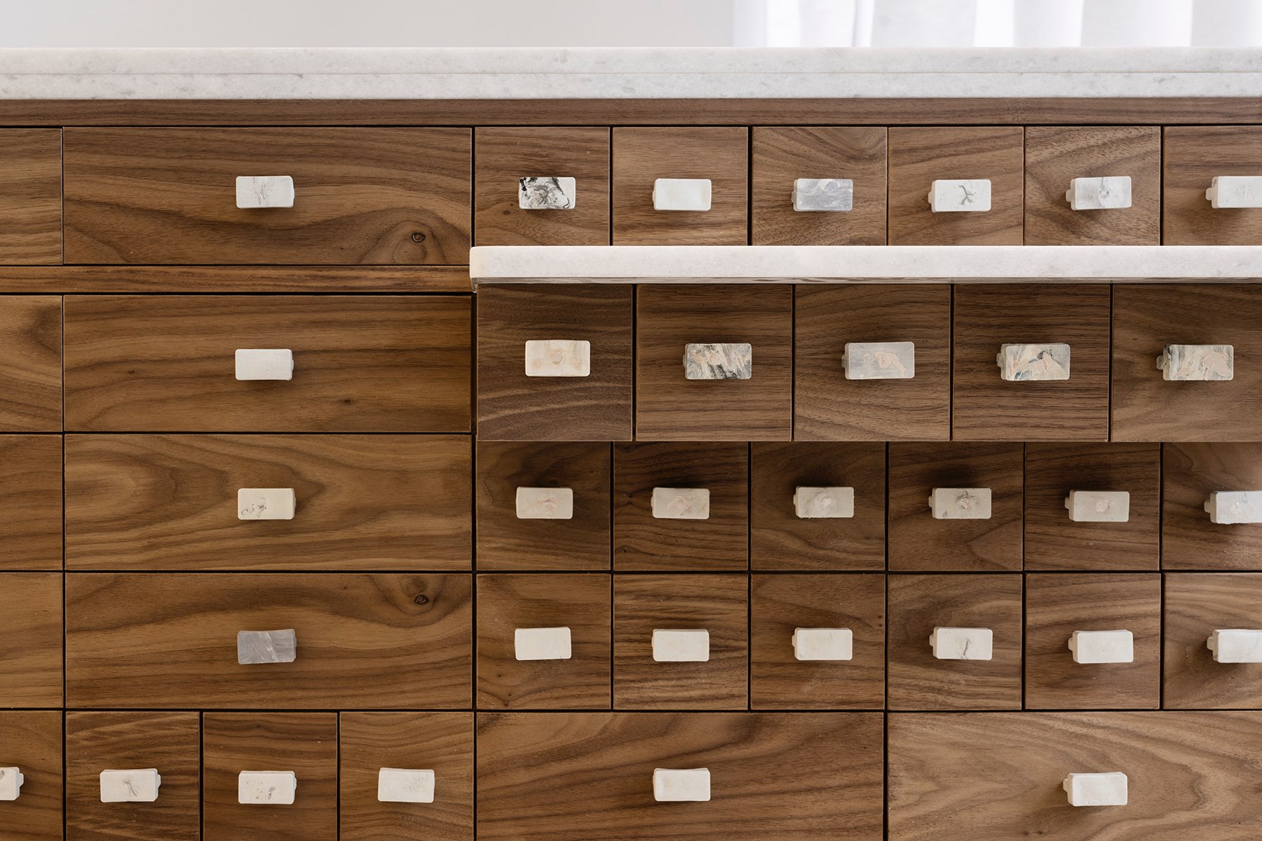 Обновленный интерьер выстроен вокруг лаконичного архитектурного приема с повторяющимися элементами и богатой материальной палитрой. Белые плоскости, светло-серый наксийский мрамор, оцинкованный металл, текстильные занавески и американский орех создают нейтральную, но тактильно насыщенную среду. Отсылки к образу Эгейского архипелага считываются не буквально, а через свет, пропорции и фактуру.