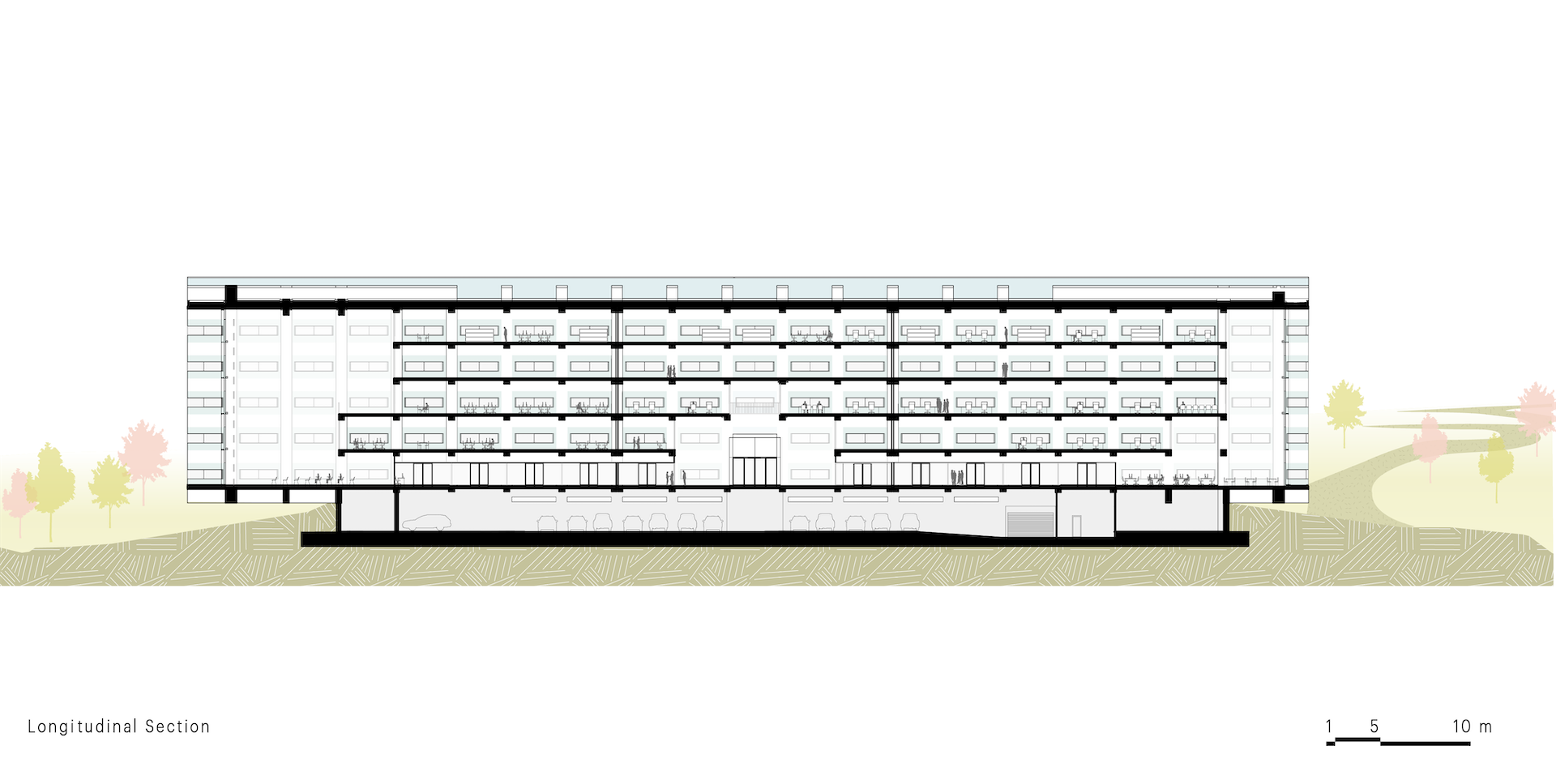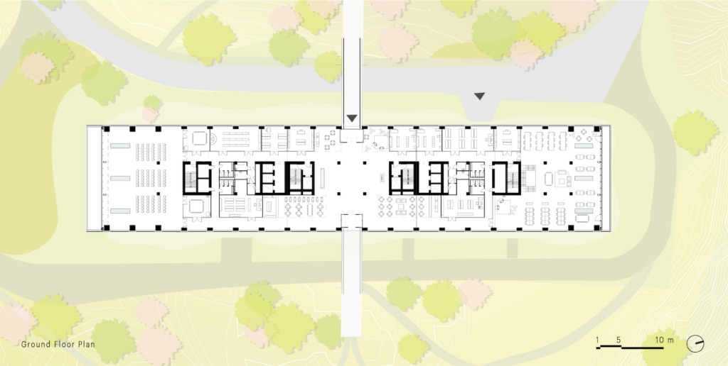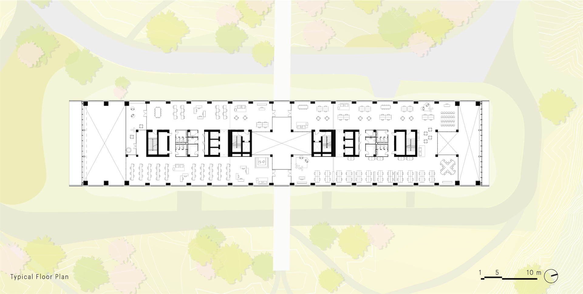 Для снижения углеродного следа в проекте применяются специальные инженерные решения: перекрытия выполнены по технологии bubble-deck с пустотами, что уменьшает объем бетона и общий вес здания. Атриумы работают как тепловые буферы с отдельным климат-контролем — за счет естественной вентиляции и напольного обогрева там допускаются перепады температур, что сокращает затраты энергии на отопление и охлаждение рабочих помещений. Такой подход не только снижает нагрузку на окружающую среду, но и продлевает срок службы здания за счет возможности легкой реконфигурации пространств в будущем.