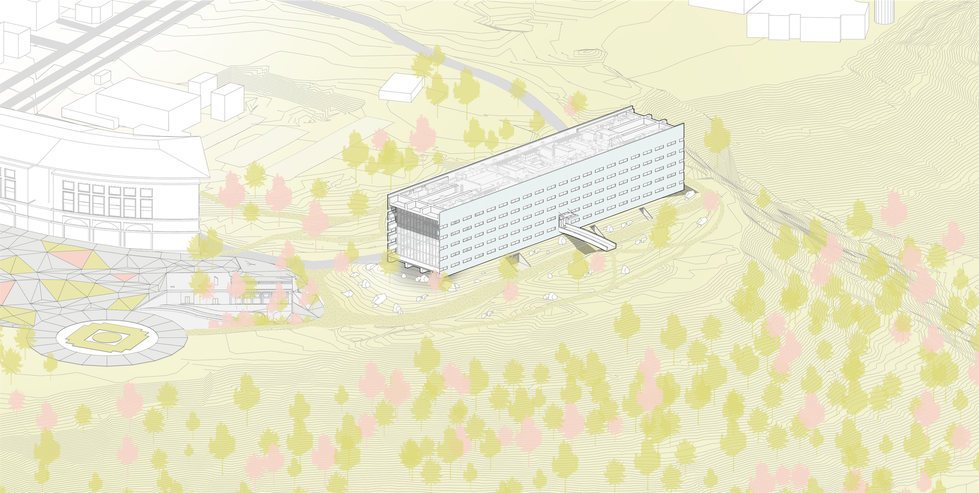 Здание представляет собой монолитный 120-метровый объем, нависающий над склонами с обоих торцов. Такое решение открывает панорамные виды на ущелье и гору Арарат и, по словам партнера MVRDV Вини Мааса, символизирует «устремленность в будущее». Подиум интегрирует постройку в ландшафт, продолжая линию парка. Фасады из полупрозрачного поликарбоната мягко рассеивают свет днем и создают легкое свечение в темное время суток.