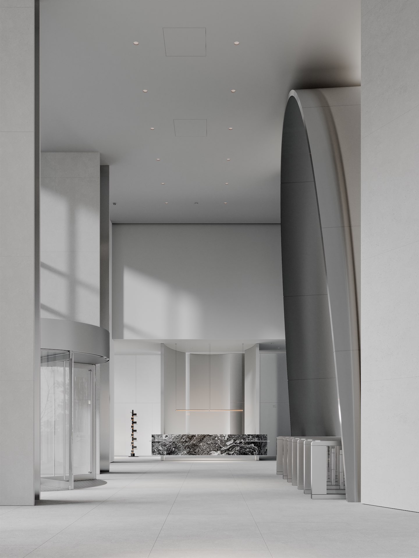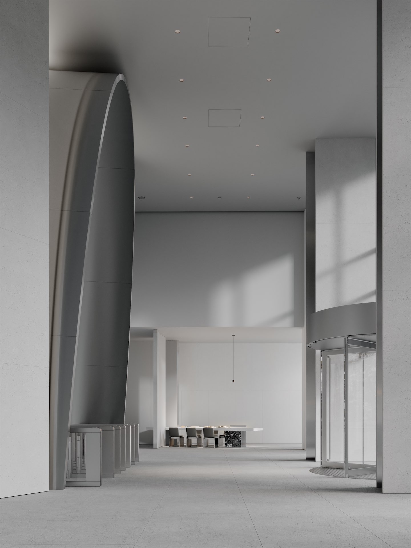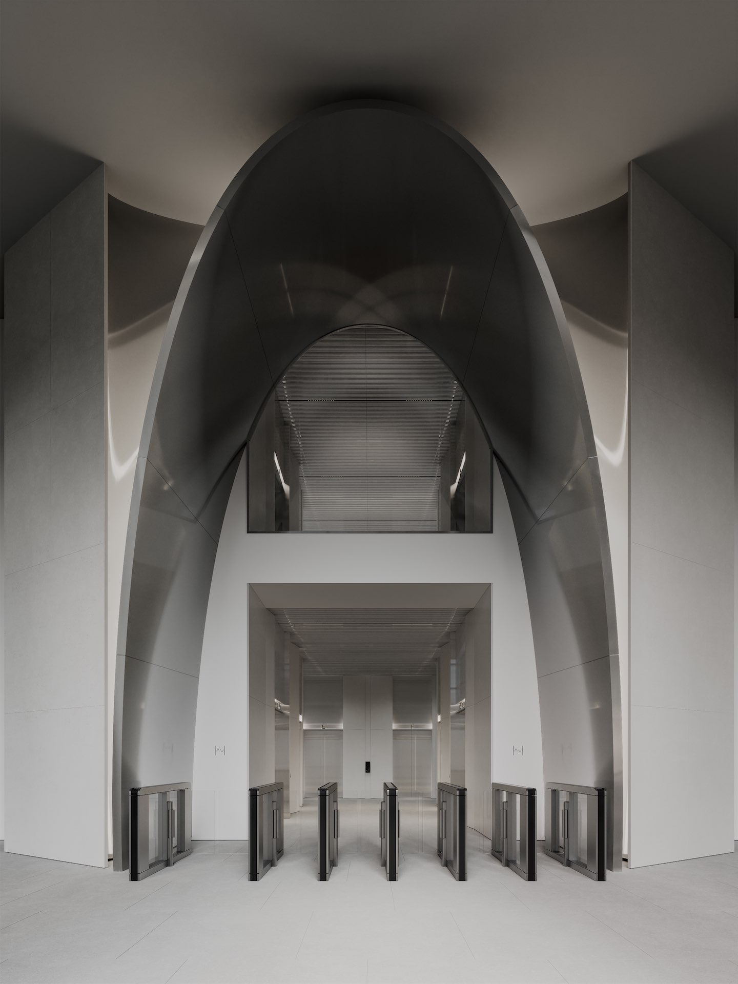 Одна из ключевых идей проекта — диалог архитектуры и интерьера. Центральный акцент лобби — металлическая арка, продолжающая мотив фасада и формирующая образ здания. Легкий наклон конструкции и интегрированная подсветка усиливают впечатление, превращая арку в смысловой и композиционный центр интерьера, заметный при входе в здание.