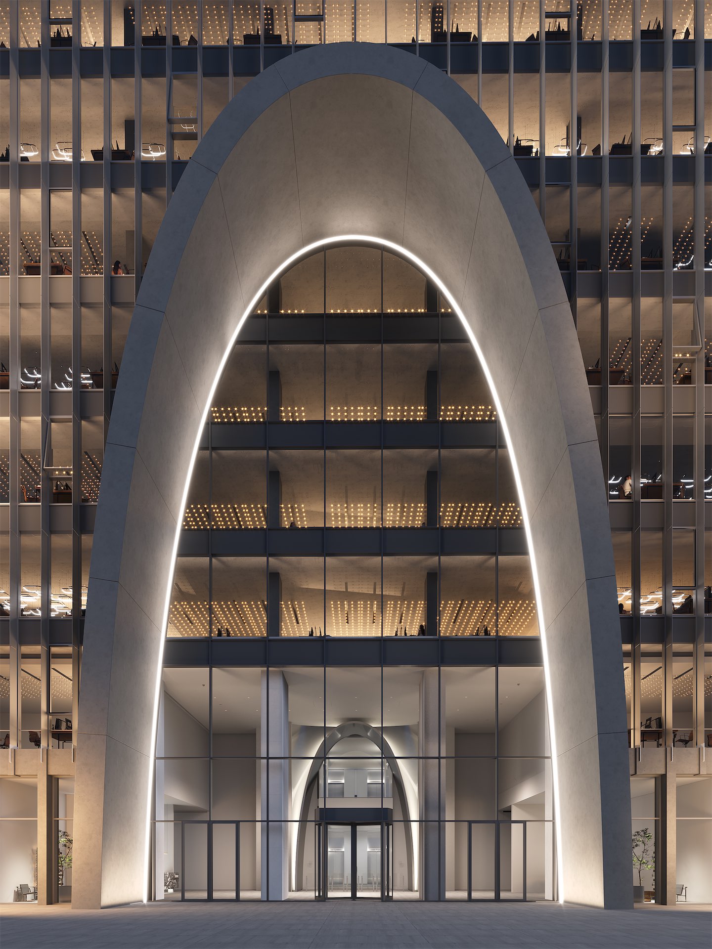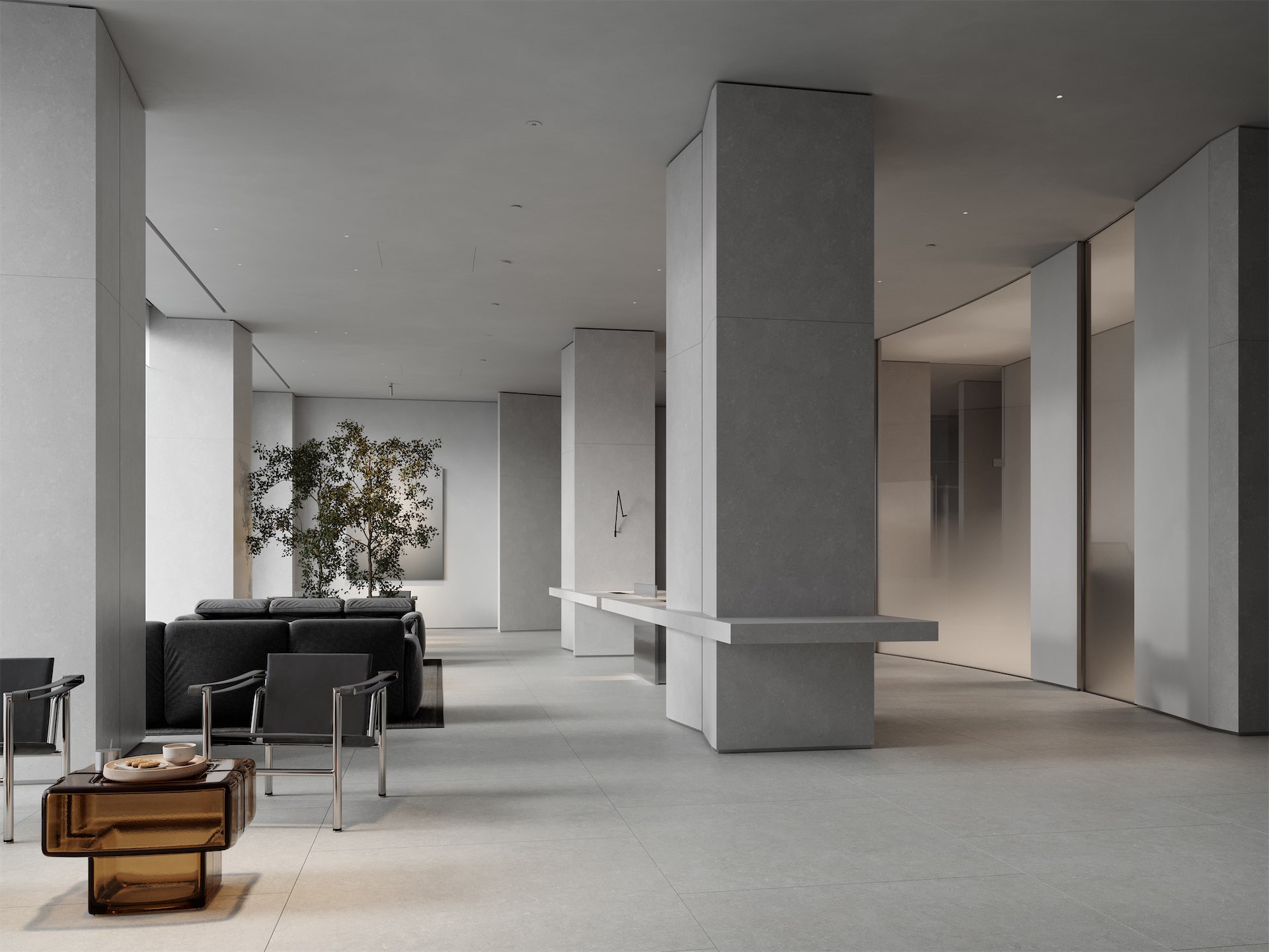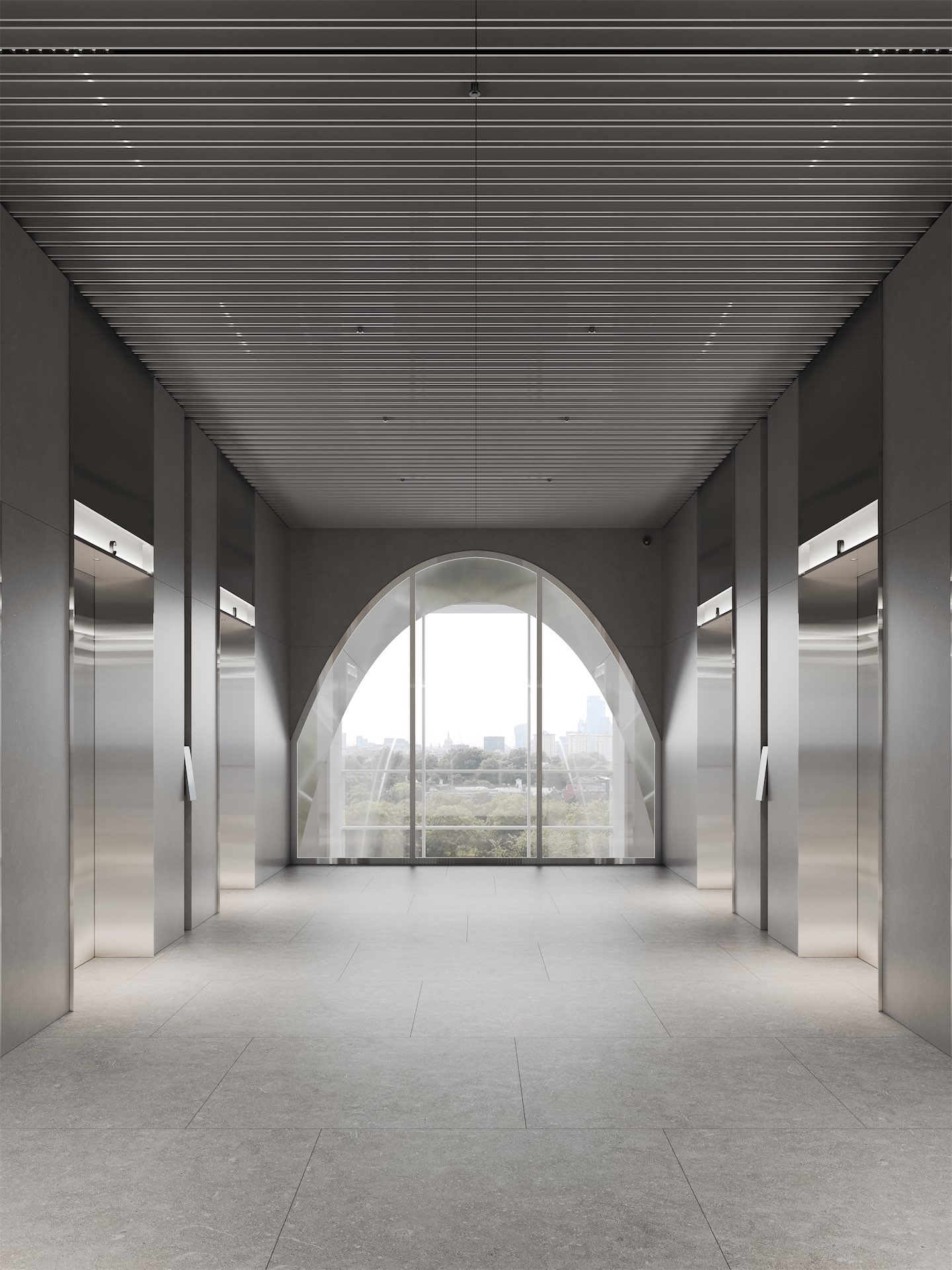 Одна из ключевых идей проекта — диалог архитектуры и интерьера. Центральный акцент лобби — металлическая арка, продолжающая мотив фасада и формирующая образ здания. Легкий наклон конструкции и интегрированная подсветка усиливают впечатление, превращая арку в смысловой и композиционный центр интерьера, заметный при входе в здание.