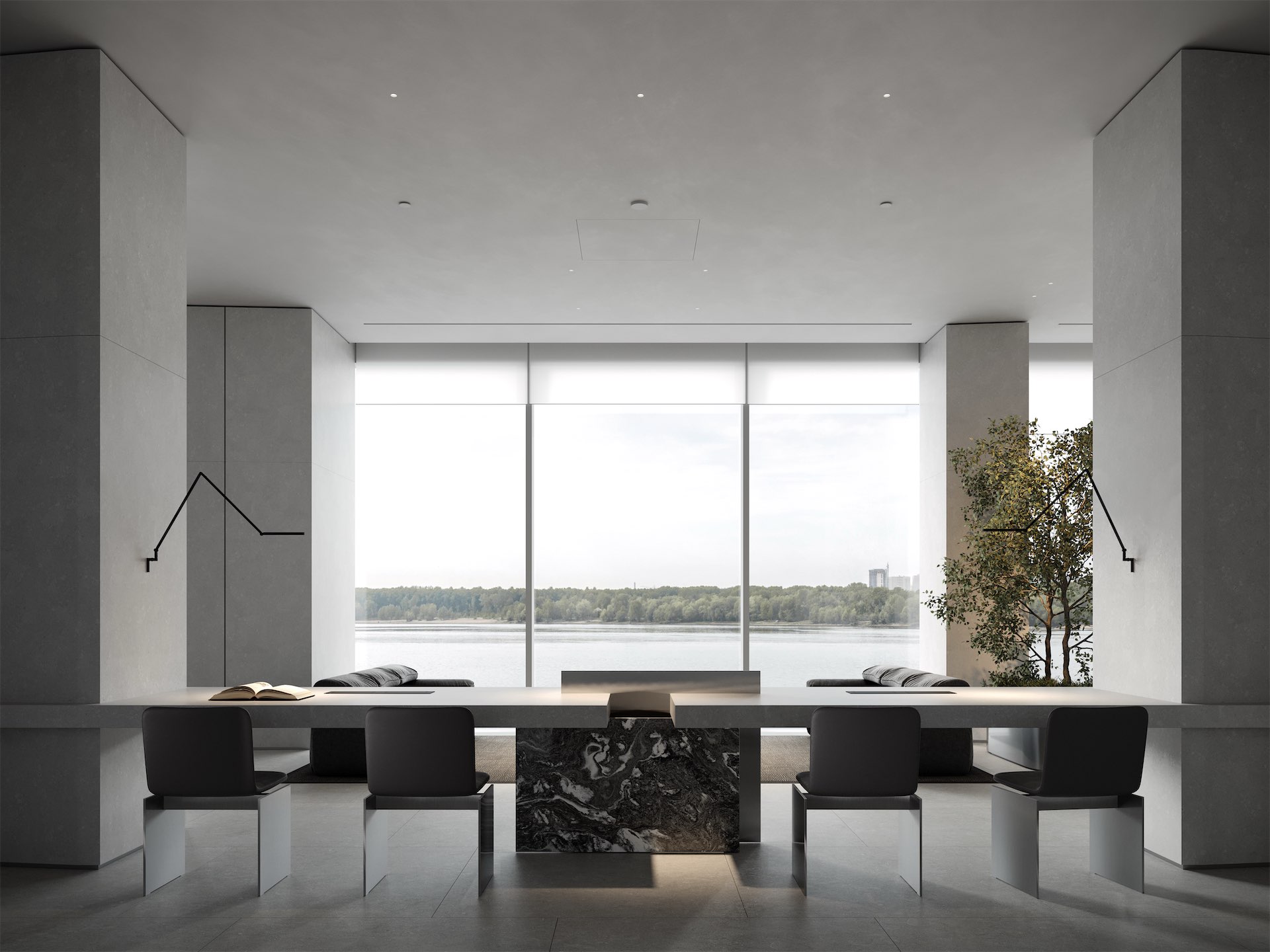 Остекление зоны кофе-поинта повторяет мотив фасада и арки лобби. В бизнес-гостиной контраст плавных и острых форм раскрывается выразительнее. Центральные колонны решены строго — их объемы выстроены с характерными треугольными гранями. Между ними интегрирована зона коворкинга, откуда открывается вид на реку. Архитекторы оставили пространство полностью открытым, подчеркнув непрерывность визуальной перспективы.
