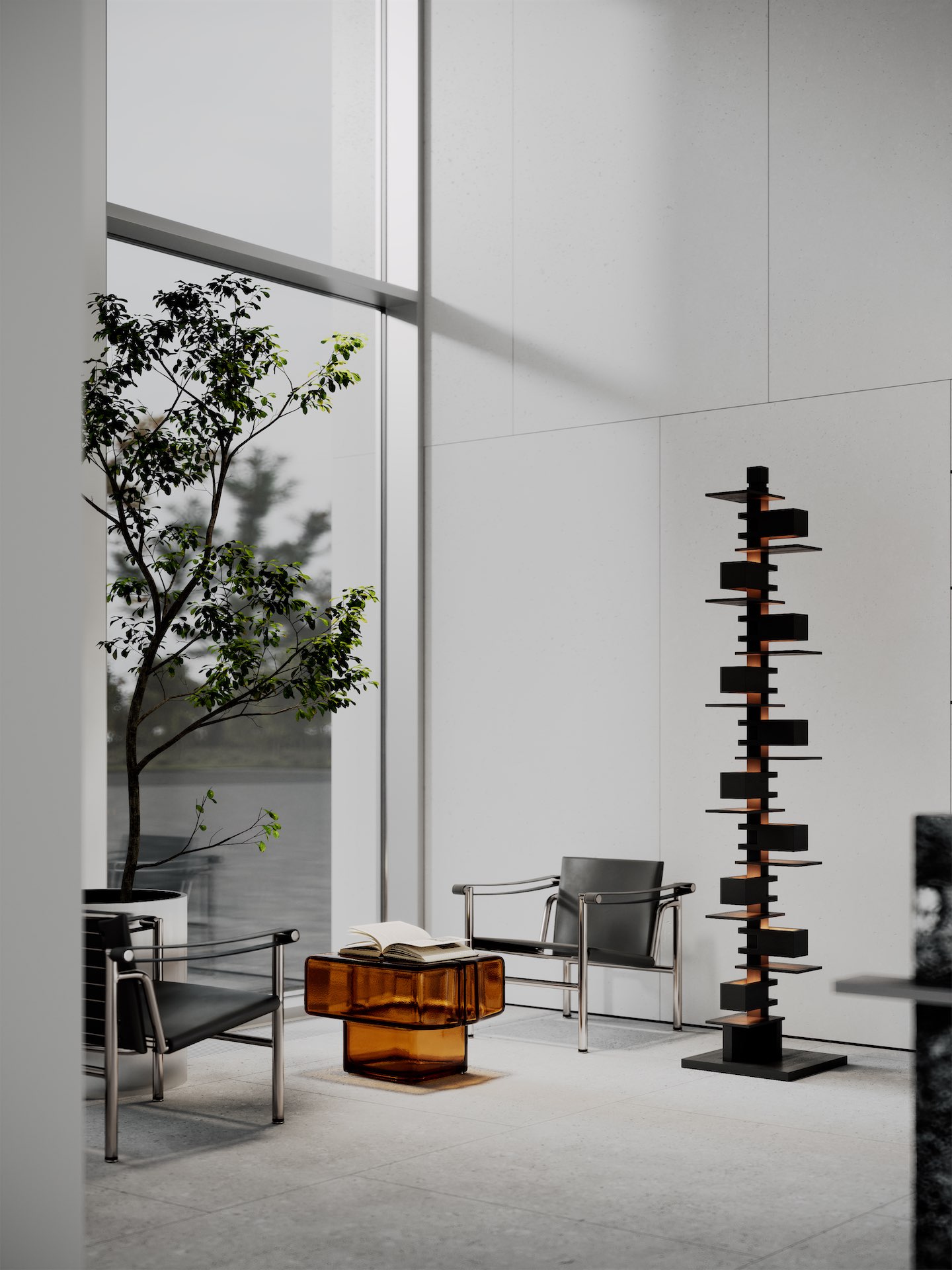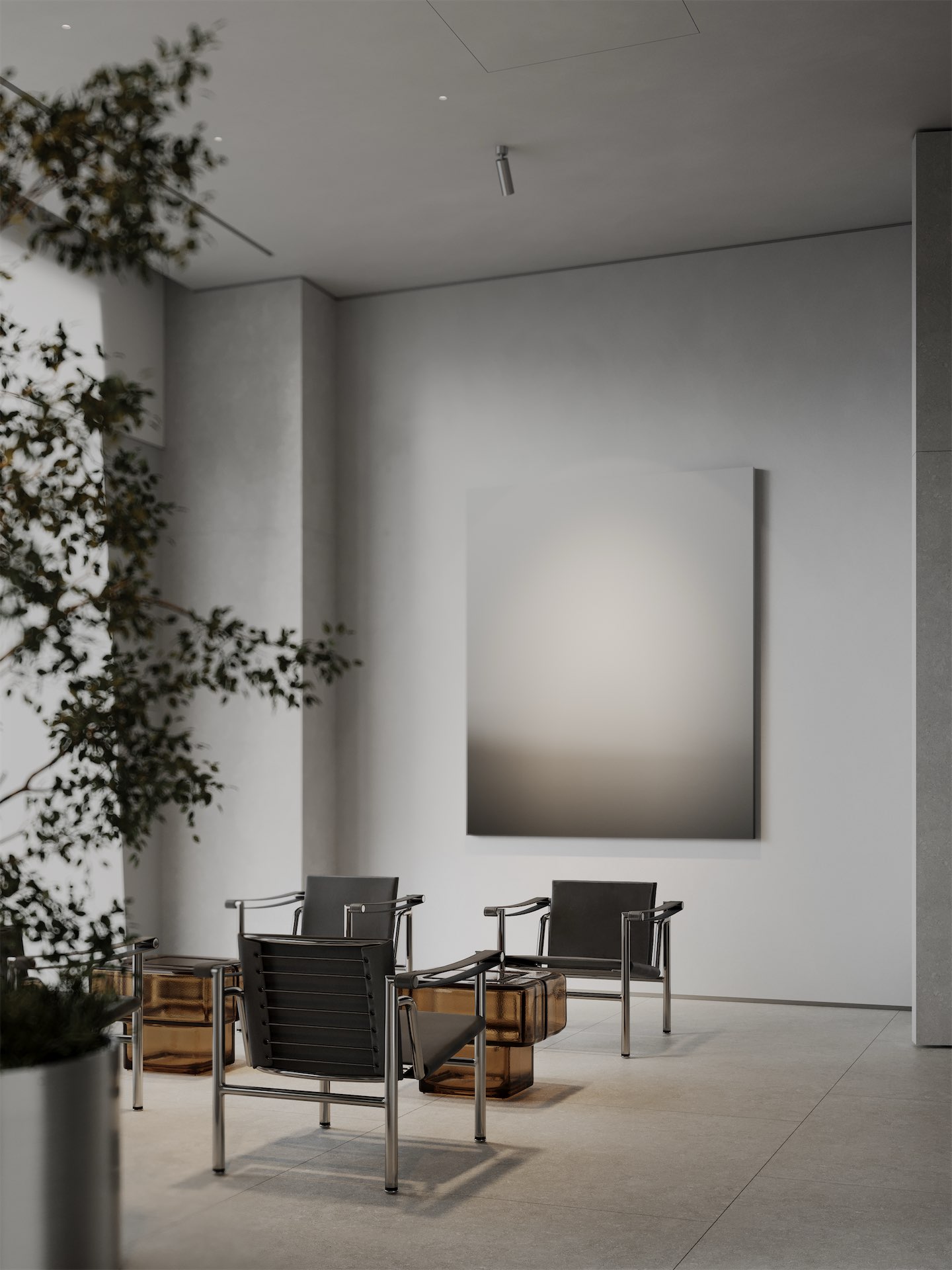 Зона встреч и ожидания также вплетена в архитектонику пространства: стол развернут под углом и буквально пронизывает стену, объединяя лобби и смежный коридор. Такой прием позволил создать новые сценарии движения и взаимодействия, запустить свет вглубь лобби.
