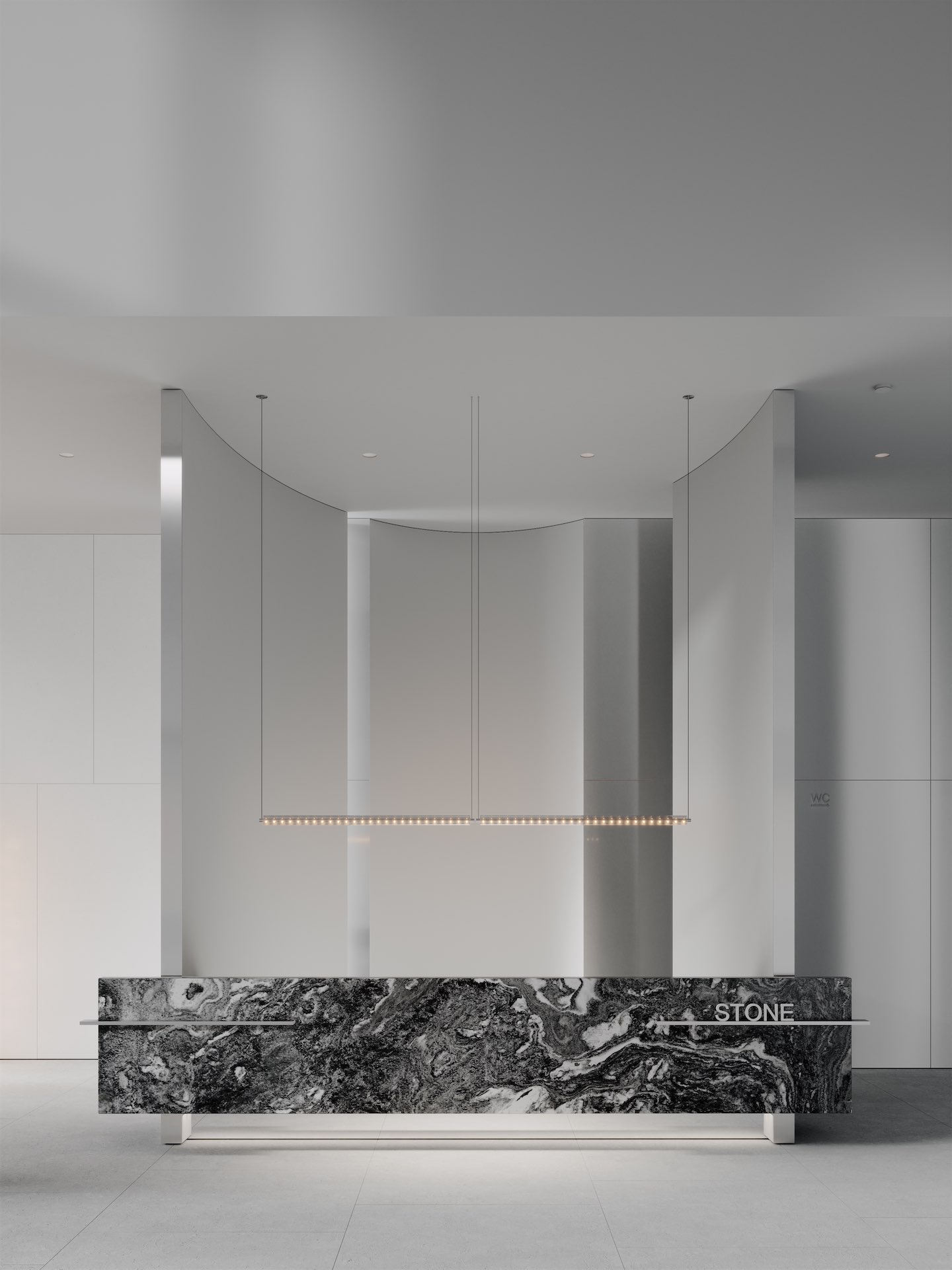 Функциональное зонирование построено скульптурно. Решение зоны ресепшн — каркас арочной формы. Полукруглый объем прорезает линия стены и создает смещенную композицию, позволяя свету проникать вглубь пространства. Минималистичная стойка выделена активной текстурой натурального камня. Благодаря зеркальному цоколю и подсветке, она словно парит в воздухе.
