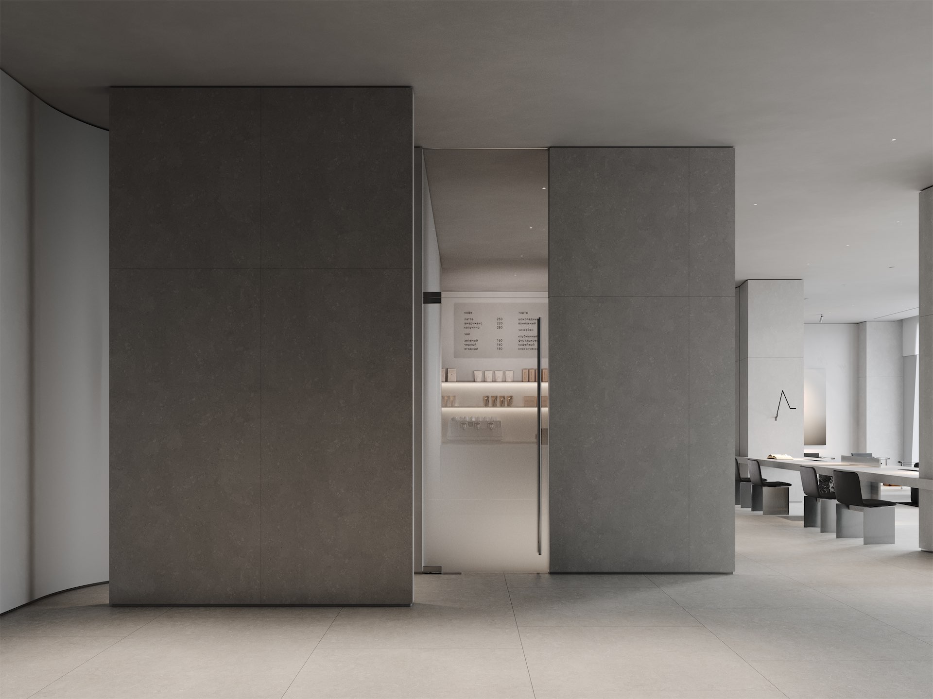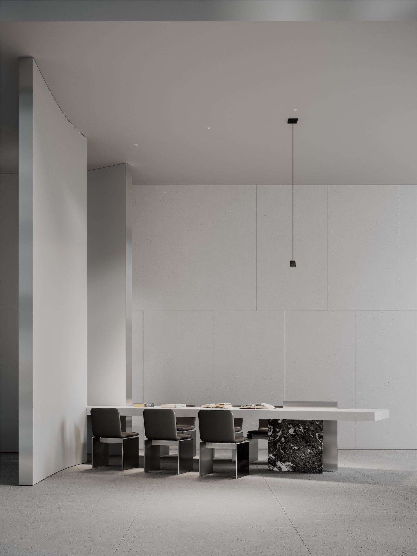 Предельная лаконичность материалов подчеркивает пластику интерьера. Архитекторы подобрали палитру так, чтобы она усиливала объемы через светло-серые оттенки и чистые, спокойные фактуры. На этом сдержанном основании акцентно звучат предметы мебели, в отделке которых применяется текстура темного камня, нержавеющая сталь и цветное стекло.