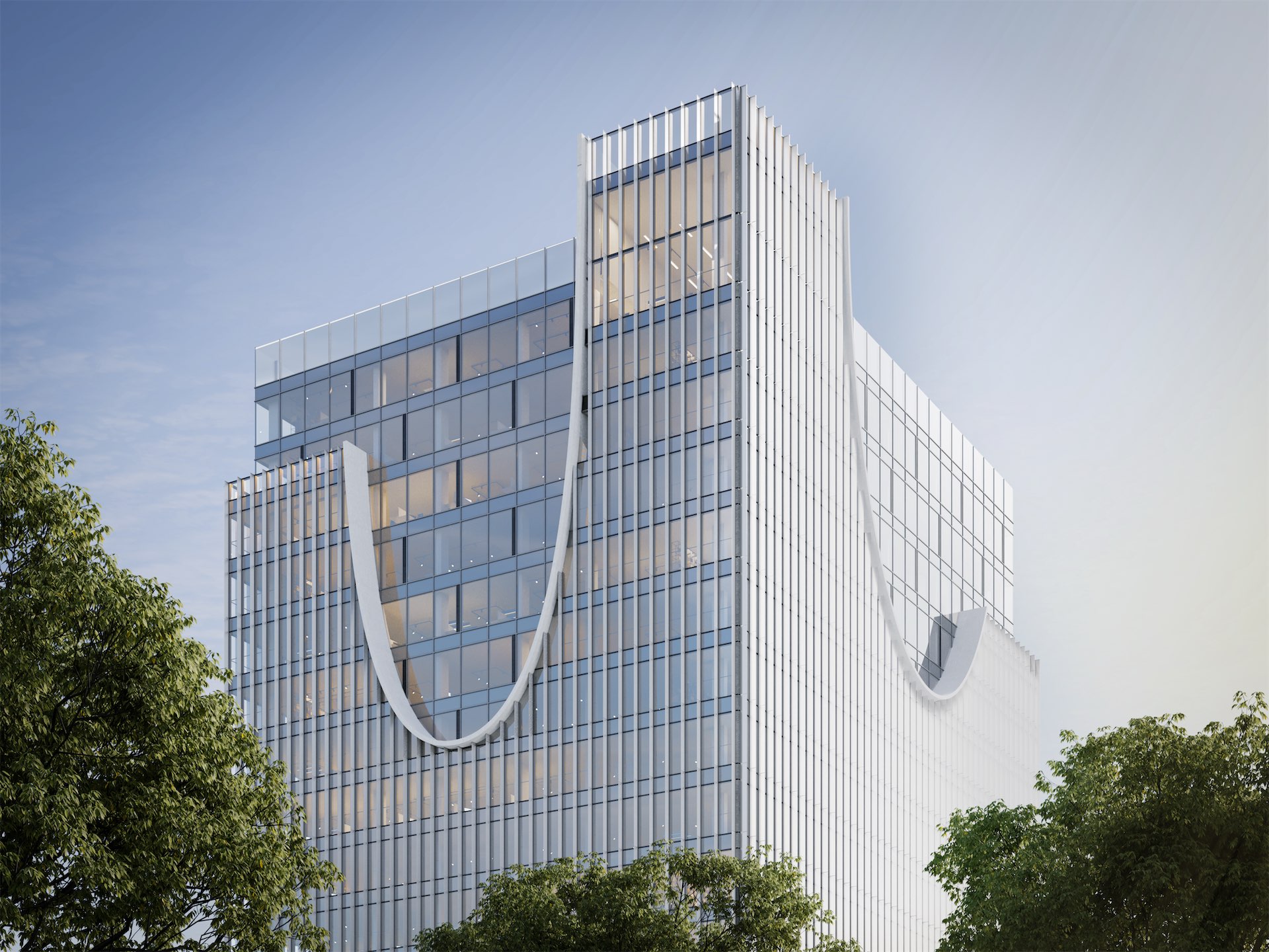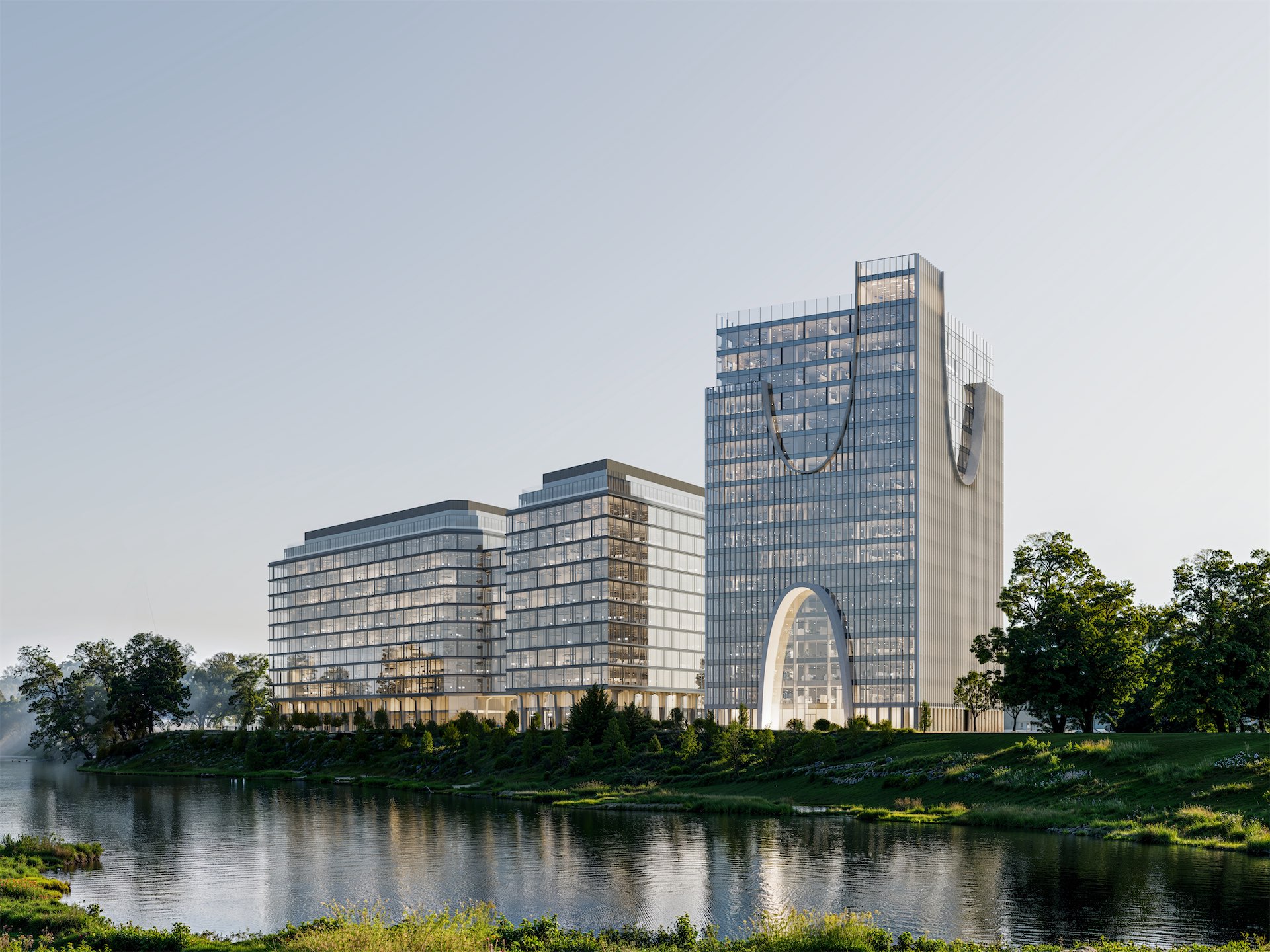 Первый объем — вытянутая вертикаль с преимущественно стеклянными фасадами. Легкость образа усиливается металлическими ламелями, которые смягчают отражения воды, зелени и городской застройки. Контрапунктом выступают крупные арочные элементы, проходящие сквозь фасад и работающие как пространственные и визуальные ориентиры. В интерпретации Kleinewelt Architekten арка становится не декоративным мотивом, а связующим элементом между городом и рекой.