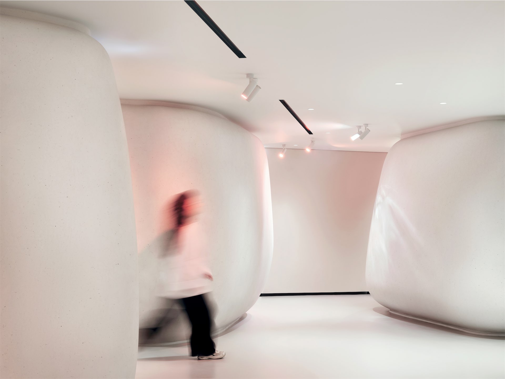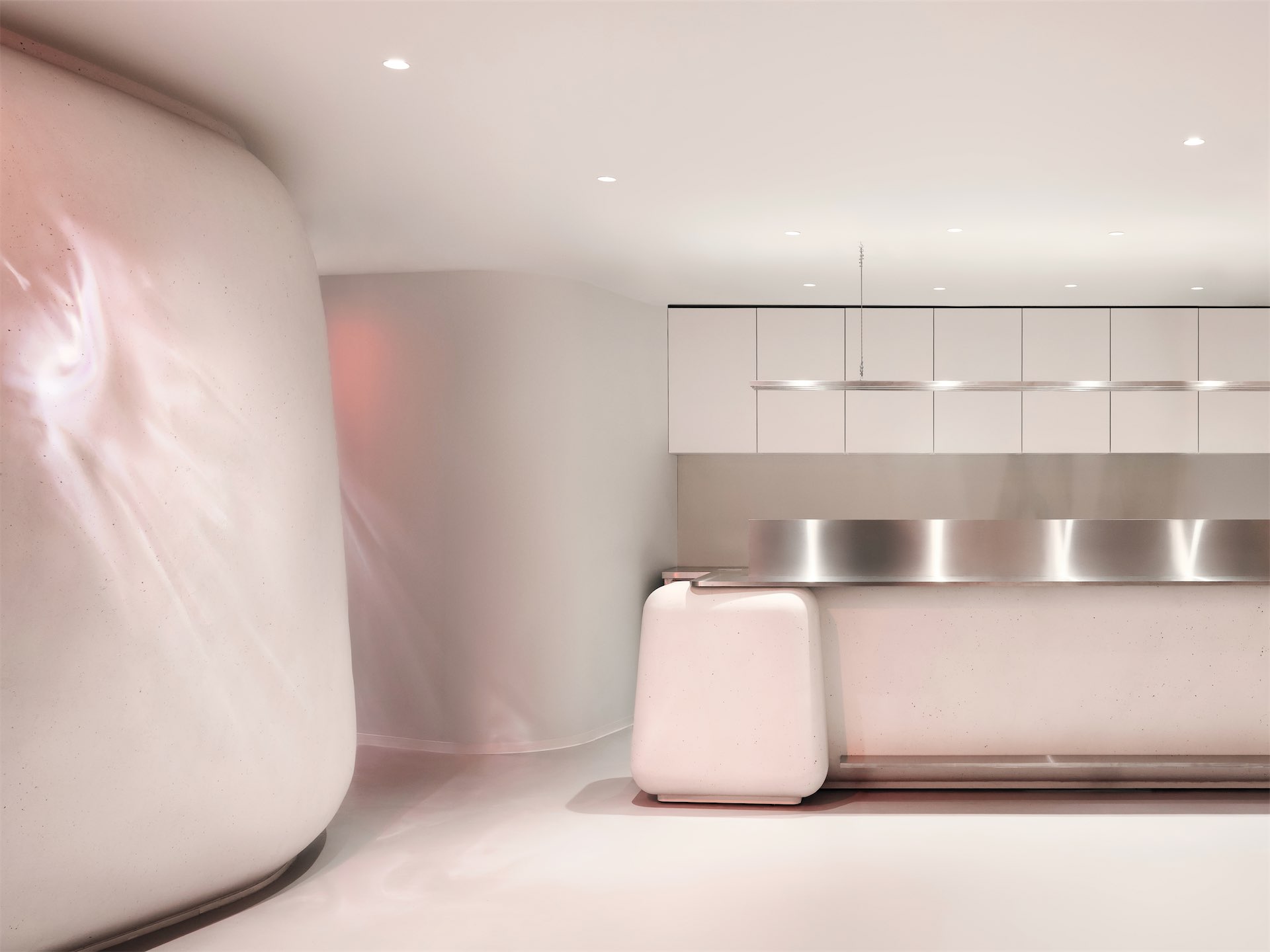 Чтобы гармонично вместить все функции и уйти от офисной планировки, медицинские кабинеты разместили вдоль окон, а центральное пространство обыграли огромными биоморфными объемами, скрывающими колонны. Так удалось избежать глухих коридоров и тупиков, создать открытые зоны для общения и отдыха, а формы придали пространству ощущение естественности и мягкости. Потолок, пол и объемы выполнены в близких по тону материалах, поэтому интерьер словно перетекает сам в себя, создавая ощущение пространства вне времени и места.