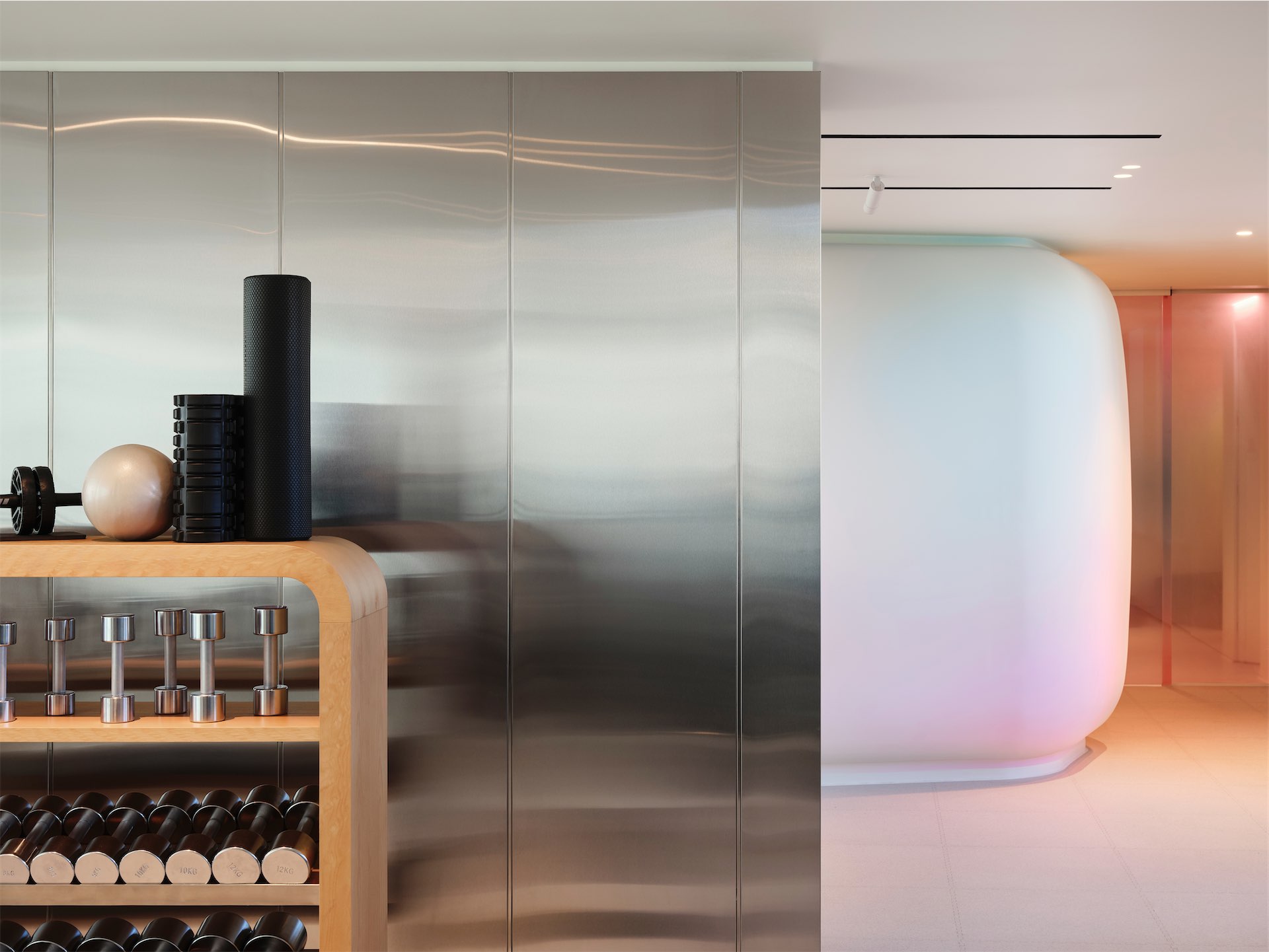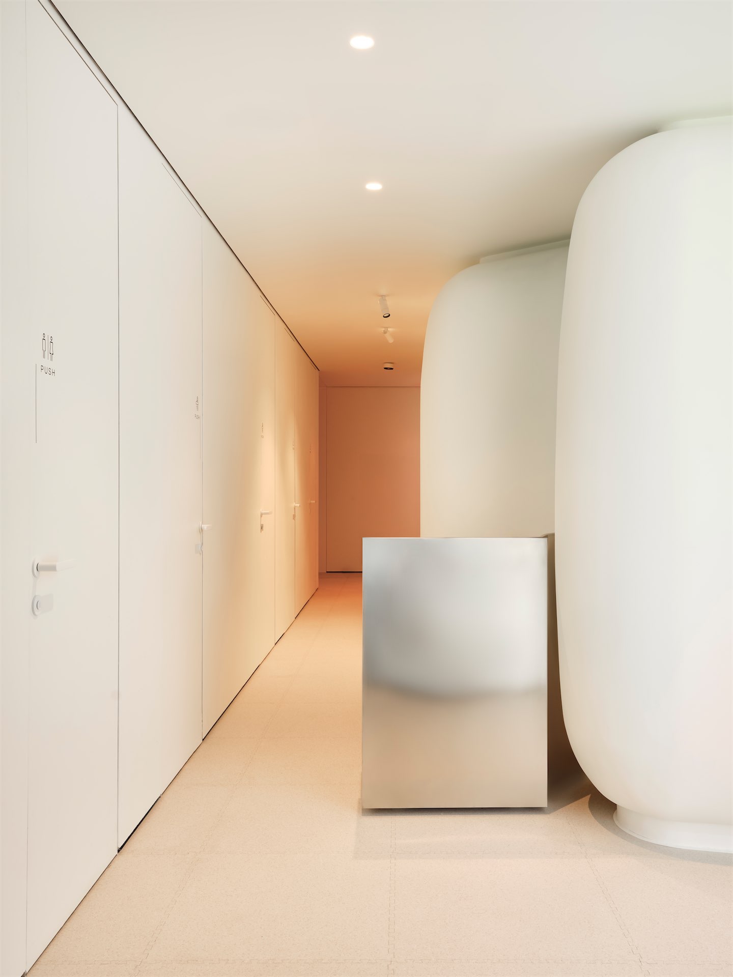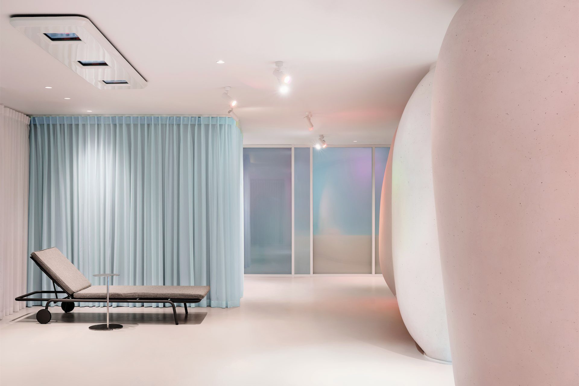 Световой дизайн усиливает ощущение медитативности и настраивает на внутреннюю тишину. Помимо общего технического освещения, архитекторы разработали несколько световых сценариев, которые меняют восприятие пространства и создают разные эмоциональные акценты: где-то появляется эффект каустики от воды, а где-то эффект радуги. Также в интерьер интегрированы работы современных медиа-художников. В зависимости от специфики процедуры нейтральные светлые кабинеты превращаются в тепло-персиковые или сине-голубые.