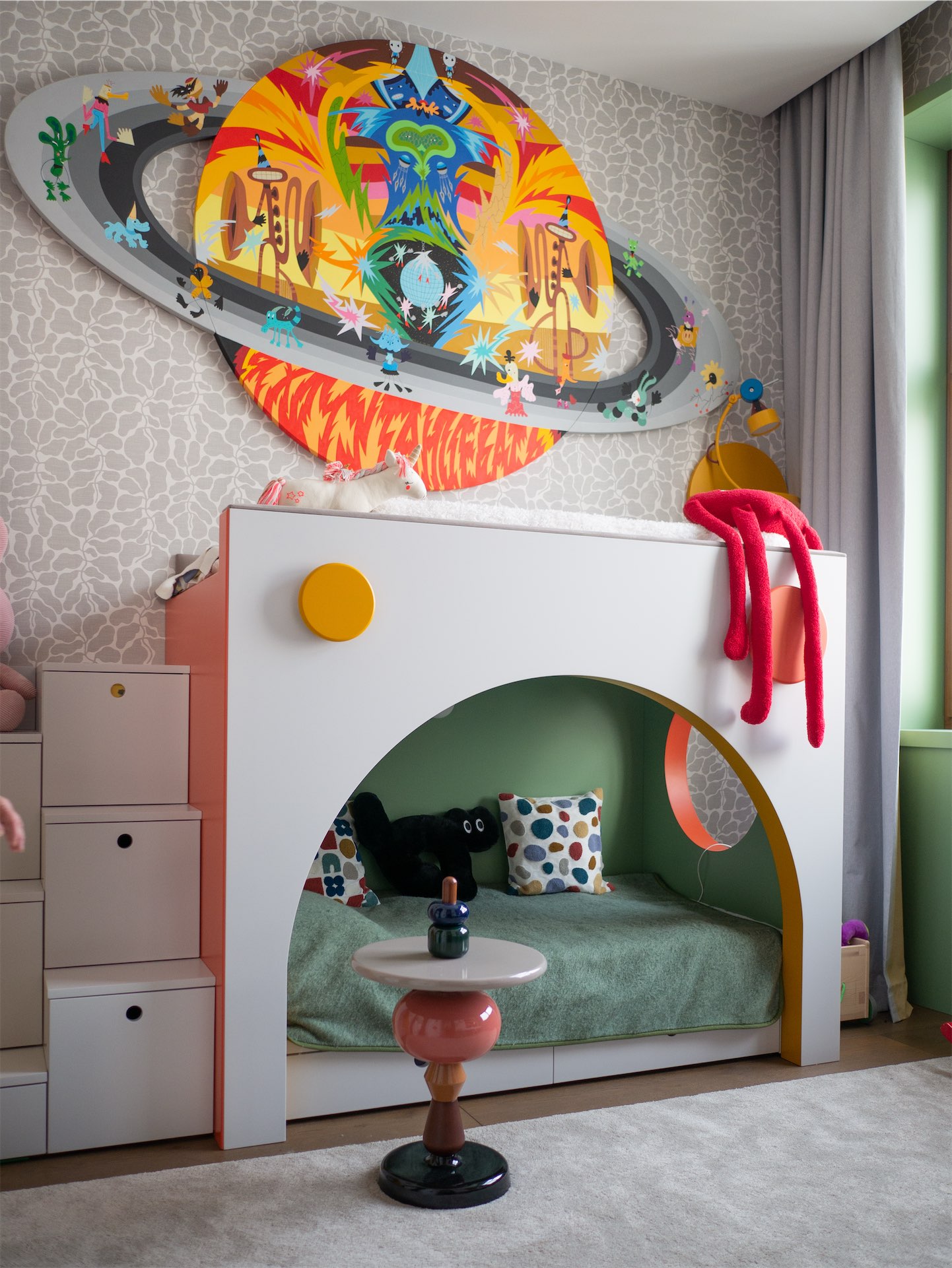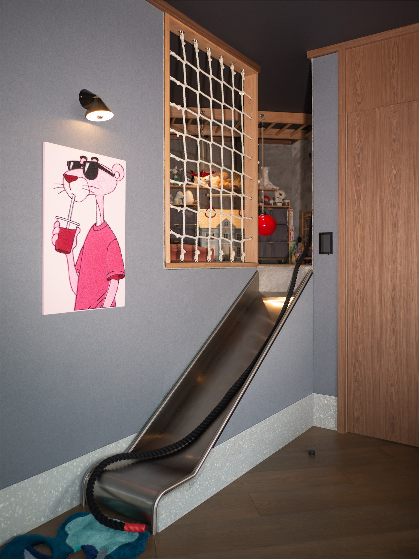 В квартире несколько детских зон, каждая со своим сценарием. Игровая с горкой, сетками и маршрутами превращена в закрытый мир для детей, куда взрослым вход воспрещен. А детская Агаты — это пространство для сна, работы и учебы.