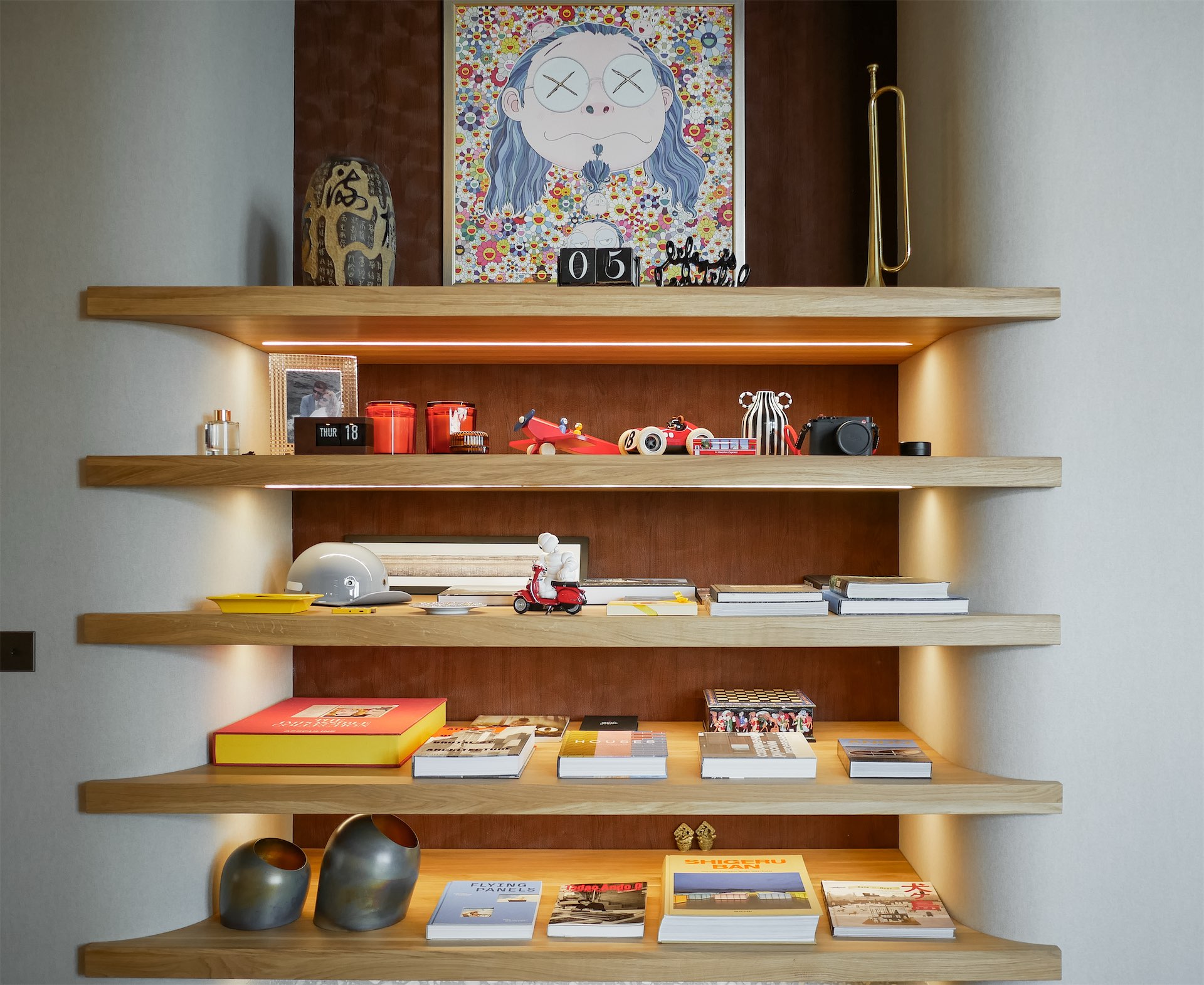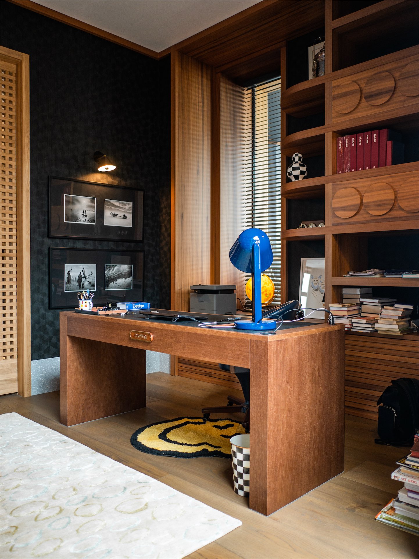 Особое внимание уделено системам хранения: высокие стеллажи почти под потолок, подоконники, переходящие в ящики, скрытые шкафы. Пространство визуально остается чистым, несмотря на обилие книг, предметов дизайна и винтажной техники.