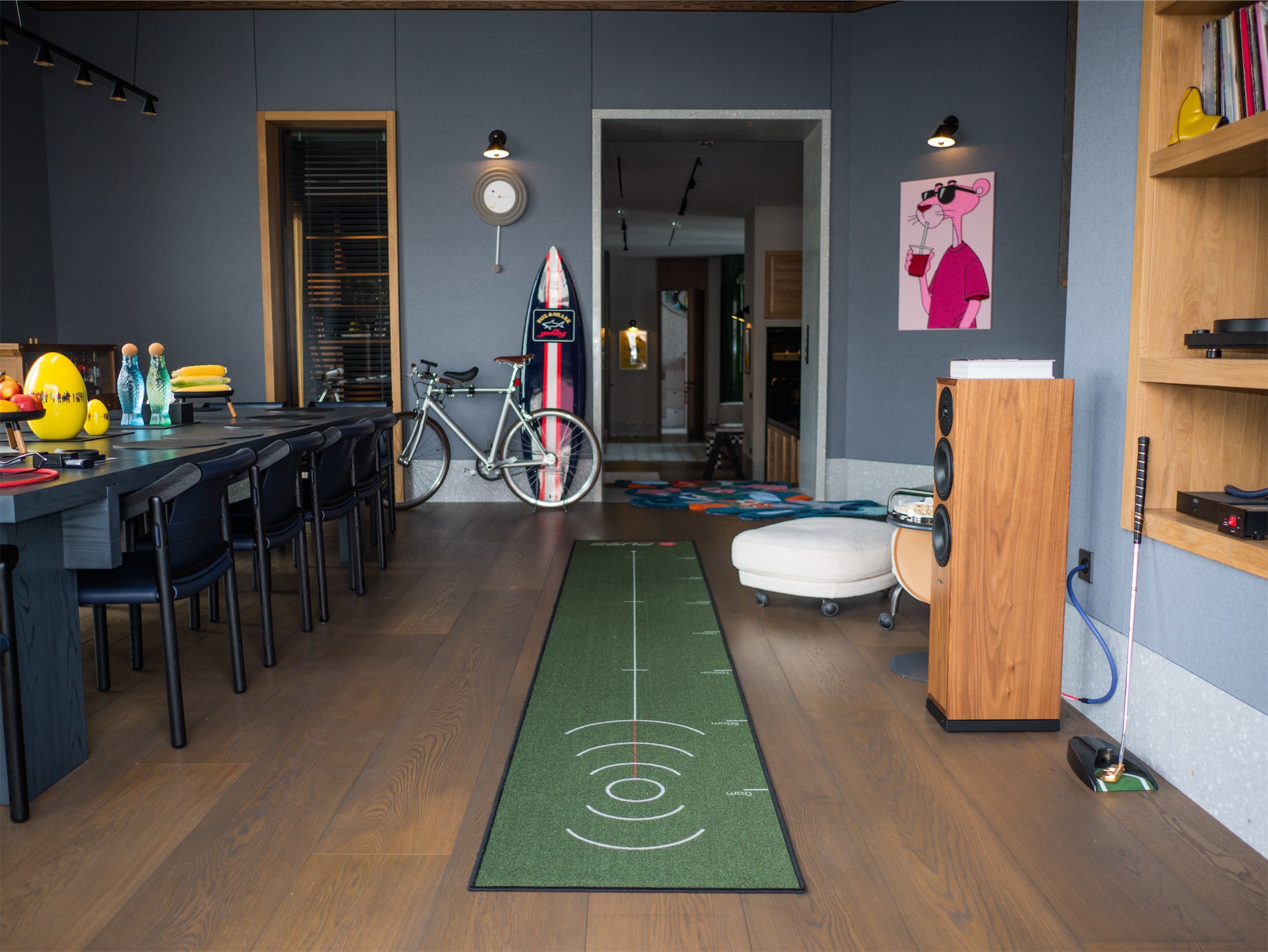Границу между общественной и приватной частью (кабинет, библиотека, системы хранения и спальня) обозначает подвижная ширма площадью шесть квадратных метров и весом 150 килограммов. Это инженерный объект с индивидуально разработанной системой направляющих.