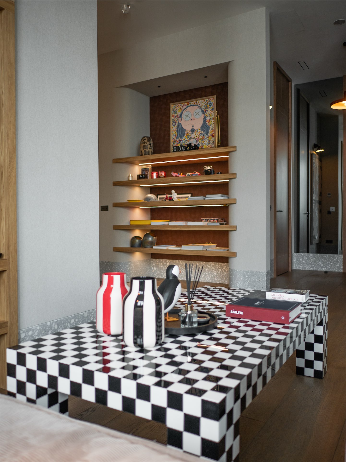 Коллекция современного искусства, которую супруги собирают много лет, не была «вписана» в готовый интерьер — напротив, стены и свет изначально проектировались под конкретные работы. Работы художников — от Ольги Солдатовой до Вовы Перкина — здесь не украшают пространство, а структурируют его.