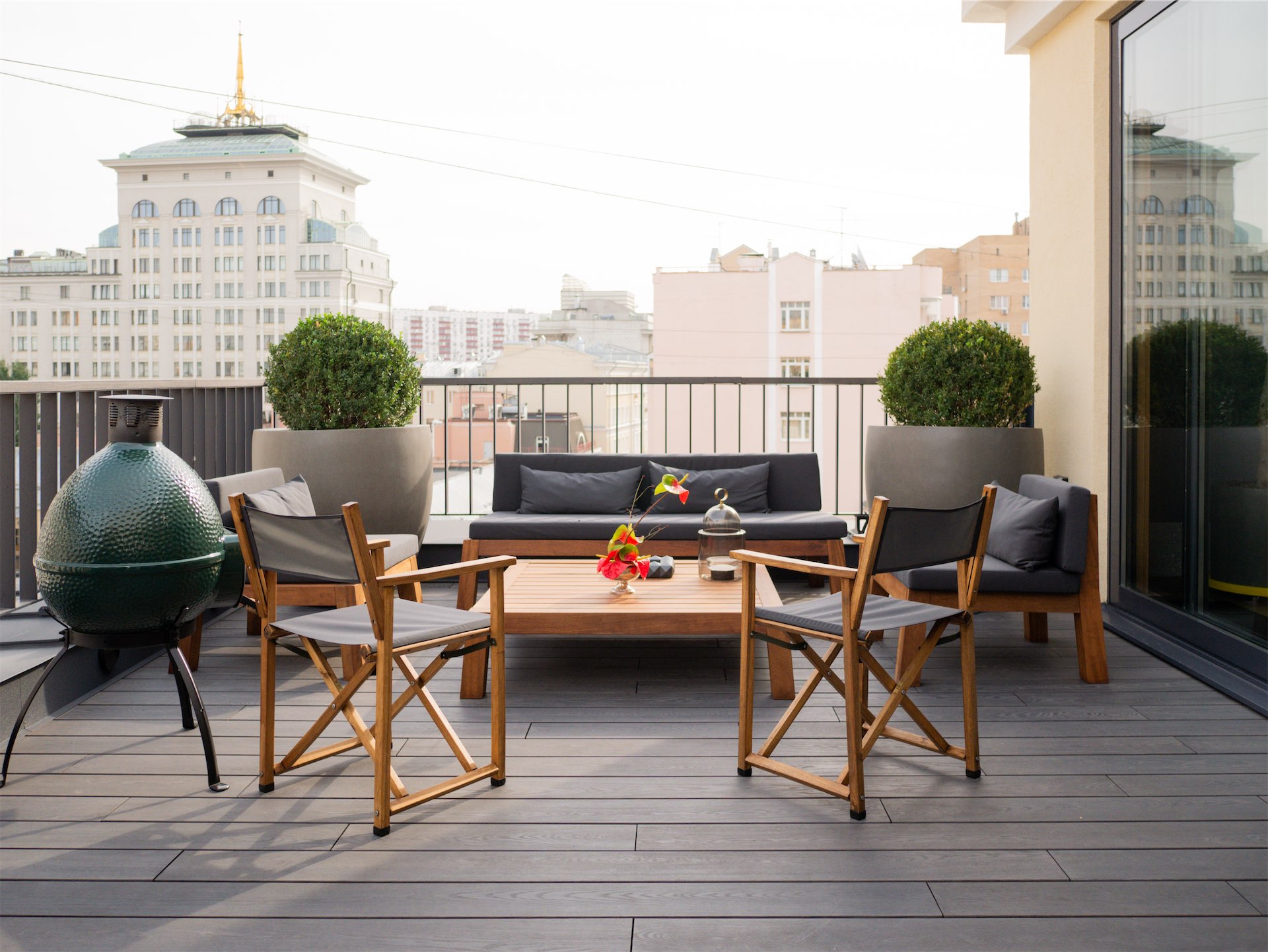 «Для меня терраса — обязательный признак качественного жилья. Не балкон, не лоджия, а именно открытое пространство под небом», — говорит Станислав. В теплое время года здесь будут устраивать ужины, главные «герои» которых гриль Big Green Egg и стол, в который встроены горшки с тимьяном, розмарином, лавандой — «готовишь и сразу срезаешь с куста». А этой зимой Станислав и Ирина поставили на террасе елку. Мягкий снег, плотные датские ветки и теплая подсветка создали атмосферу, которая радовала не только обитателей квартиры, но и соседей напротив.